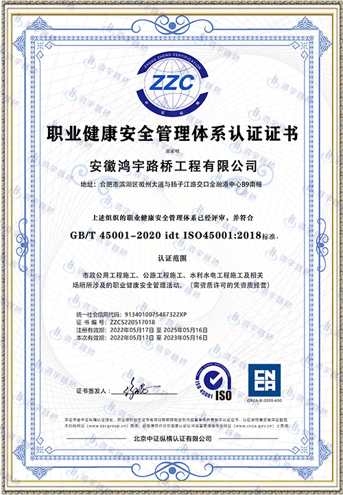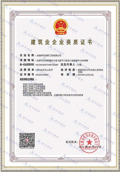 安徽鸿宇路桥工程有限公司成立于2003年10月14日,公司原名为安徽省现代路桥工程有限责任公司,后于2011年11月公司重组更名为安徽鸿宇路桥工程有限公司。公司注册资本10016万元,坐落于合肥市滨湖新区金融港中心B9南幢。现拥有行业内众多优秀资质,包括但不限于:市政公用工程总承包壹级;公路路基专业承包壹级;公路路面专业承包壹级;建筑装饰装修专业承包壹级;环保工程专业承包壹级;公路工程施工总承包贰级;建筑工程施工总承包贰级;古建筑工程专业承包贰级;公路交通工程安全设施、公路工程机电工程分项专业承包贰级;桥梁专业承包贰级;水利水电工程总承包叁级;城市及道路照明工程专业承包叁级;公路路基路面养护乙级;交通安全设施养护等资质。